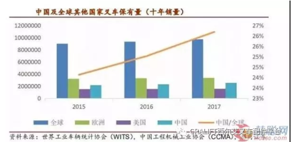 根据中国工程机械工业分会(CCMA)的数据,2017年我国叉车保有量在244.6~265万台之间,取CCMA每年公布的区间的中值作为我国叉车保有量的估计值。考虑到叉车使用寿命约为10年,用过去10年的叉车累积销量近似估计全球、