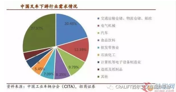 叉车的下游应用行业十分广泛,制造业和物流业的对叉车需求*,从我国叉车分行业的销售情况来看,制造业约占52%,交通运输仓储、物流仓储及邮政业约占21%。