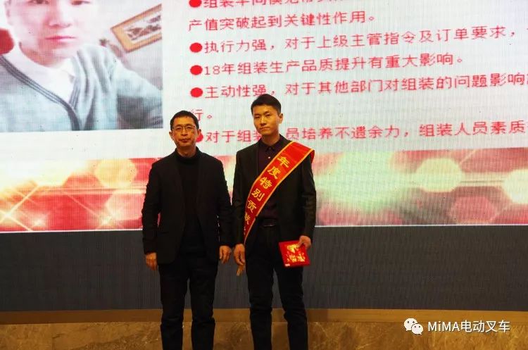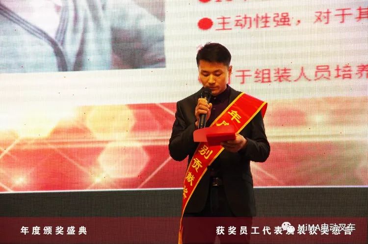 年会盛典还设置了颁奖环节,对2018年度MiMA优秀员工、年度销售冠军、年度质量标兵、年度特别贡献奖人员进行表彰嘉奖,员工代表怀揣着激动的心情上台发表获奖感言,其余获奖者佩戴获奖勋带上台领奖,并与各领导亲切合影。 他们以坚持不懈的努力与孜孜不倦的斗志,获得了在场所有嘉宾们的热烈掌声。