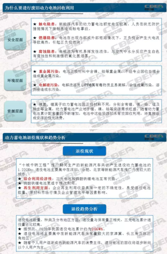 新能源汽车退役动力电池累计将达25GWh。如此规模的退役动力电池,如果不能妥善处置,势必将对生态环境造成新一轮的污染,也将影响到我国新能源汽车及动力电池产业的健康发展。面对这一严峻的形势,国家工业和信息化部联合其他六部委于2018年年初制定了《新能源汽车动力蓄电池回收利用管理暂行办法》,并展开了新能源汽车动力蓄电池回收利用试点工作。历时一年,工信部于今年2月2 2日发布了《新能源汽车动力蓄电池回收利用调研报告(简介)》。