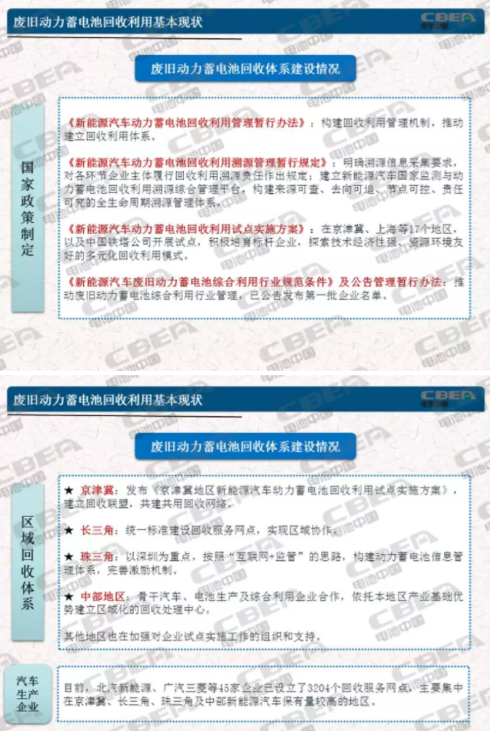 据工信部介绍,现阶段新能源汽车动力蓄电池回收体系建设存在两种模式:一种是以汽车生产企业为主导,由其利用销售渠道建设退役电池回收体系,回收退役电池移交综合利用企业处理或与其合作共同利用电池剩余价值;另一种是以第三方为主体,由梯次、再生利用企业与汽车、电池生产企业合作,共建共用回收服务网点,集中回收合作企业的退役动力电池。