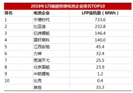从1月最新的装机量来看,2019年1月我国新能源汽车动力电池装机总电量约4.98GWh,同比增长281%。其中,磷酸铁锂电池装机电量约1.42GWh,同比增长177%。
