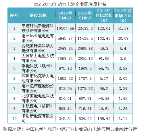 我国动力电池市场发展呈现出乘用车电池配套量增长、高能量密度电池配套增加,行业聚集度进一步提升的特点。根据中国化学与物理电源行业协会动力电池应用分会的数据统计显示,2018年度我国新能源汽车动力电池配套量超过56.89GWh,同比2017年增长56.88%,前20强企业装机量52.23GWh,占全年装机量的91.8%。其中,三元电池30.1GWh,占比58.17%,同比2017年增长103.71%;磷酸铁锂电池22.2GWh,占比39%,同比2017年增长23.51%;锰酸锂电池1.08GWh,占比1.9%,同比2017年减少26.7%;钛酸锂电池0.52GWh,占比0.91%,同比2017年减少8.99%。从各动力类型来看,纯电动汽车配套的动力电池装机量累计约53.01GWh,同比增长55.64%;插电式混合动力汽车配套的动力电池装机量累计约3.82GWh,同比增长75.34%。