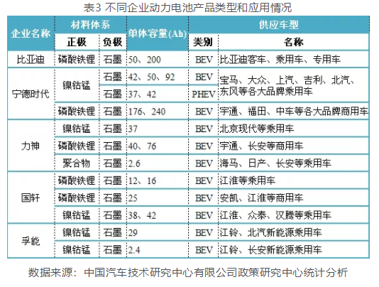从动力电池配套特征来看,动力电池行业传统领先企业宁德时代、比亚迪、力神、国轩、孚能等产品类型基本可以代表国内产品主流类型,一是材料体系主要为三元和磷酸铁锂;二是高能量密度的三元电池主要配装乘用车,高安全性低成本的磷酸铁锂电池主要应用于客车和专用车;三是除宁德时代外,国内动力电池企业配套仍以国内整车企业为主,与日韩电池配装国际知名品牌汽车的规模和影响力相比仍有差距。