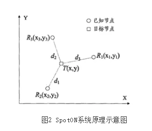 如图2所示,Hightower等提出的SpotON系统[6]是该类型算法的典型代表。系统使用3个或3个以上的读写器作为基站,记录每个读写器读到的标签接收信号强度,通过三角测距的方法,计算出标签的位置[7]。