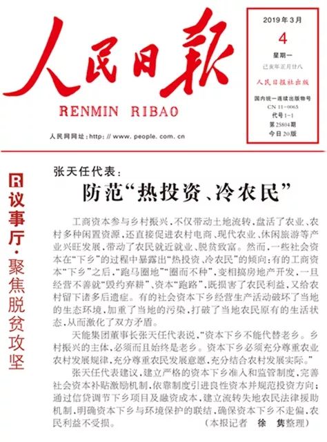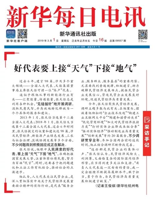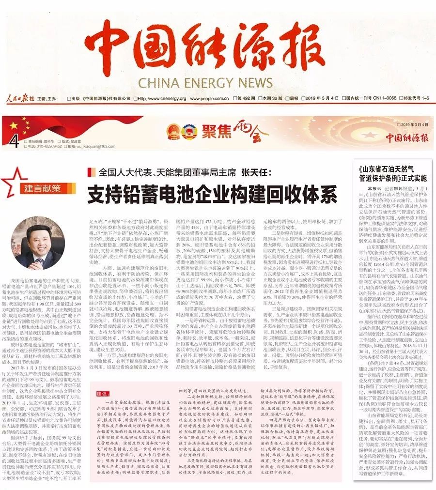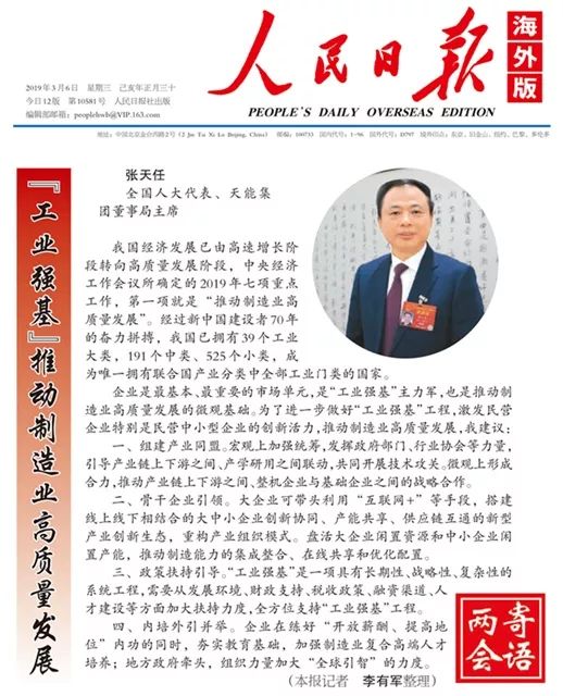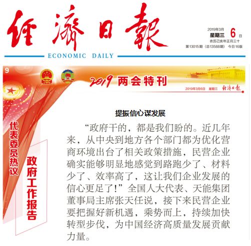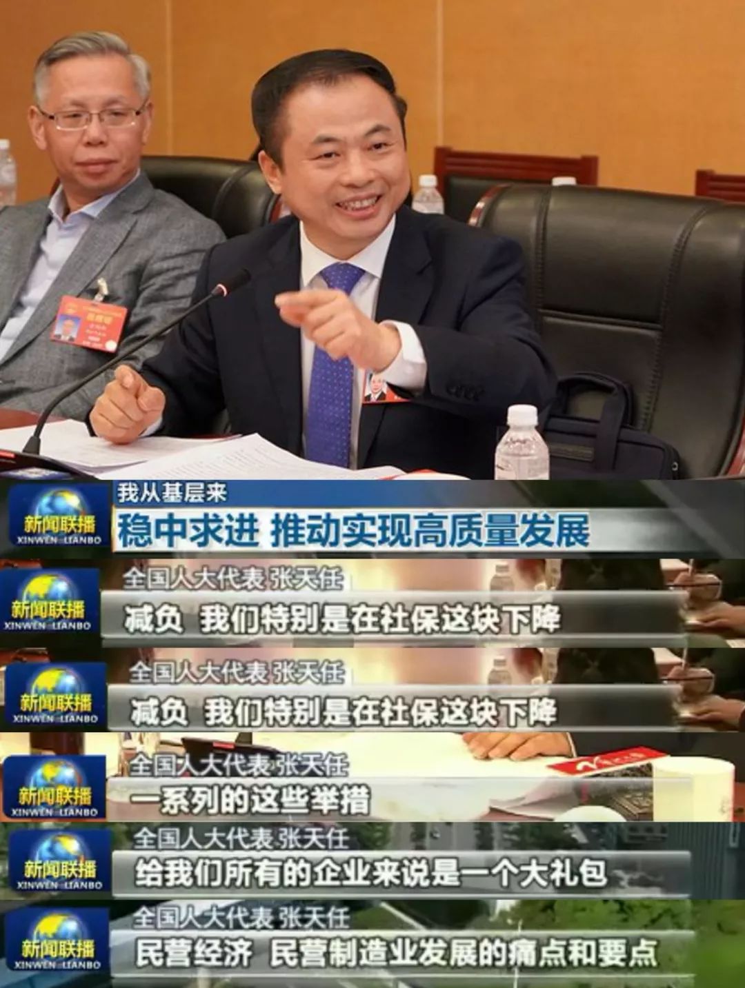 3月6日晚上,央视一套《新闻联播》播出了《我从基层来:稳中求进,推动实现高质量发展》的专题报道,其中,播出了全国人大代表、天能集团董事局主席张天任围绕2019两会热点话题“减税降费”进行发言。