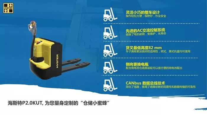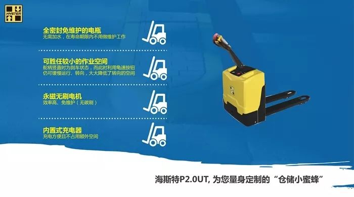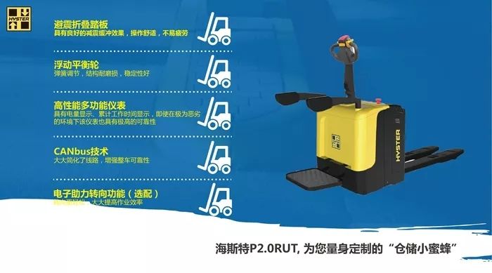 内部结构方面,P2.0RUT采用了双起升油缸,左右对称设计、浮动式驱动桥及驱动轮高度调节、大尺寸电磁制动盘 、货叉尖端带有导向轮设计。