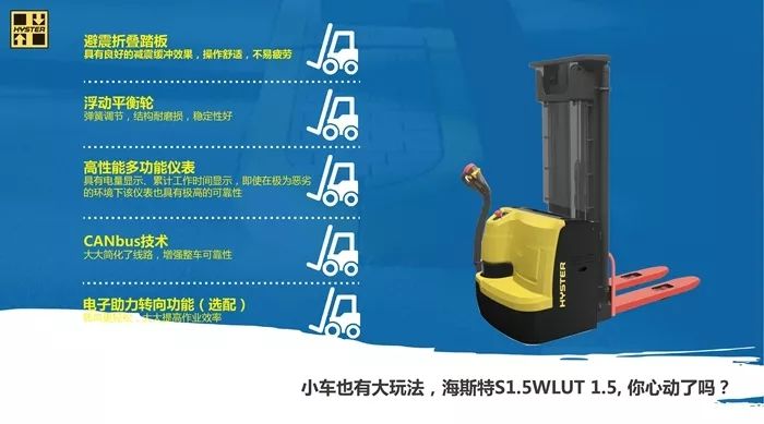 S1.5WLUT采用了经典的蝶形手柄,整合加速、前进及后退,提升及下降,龟速、喇叭、防撞为一体;单缸双柱, 采用中间单油缸提升;标配的侧拉式电池箱能够方便有效的进行电池更换。