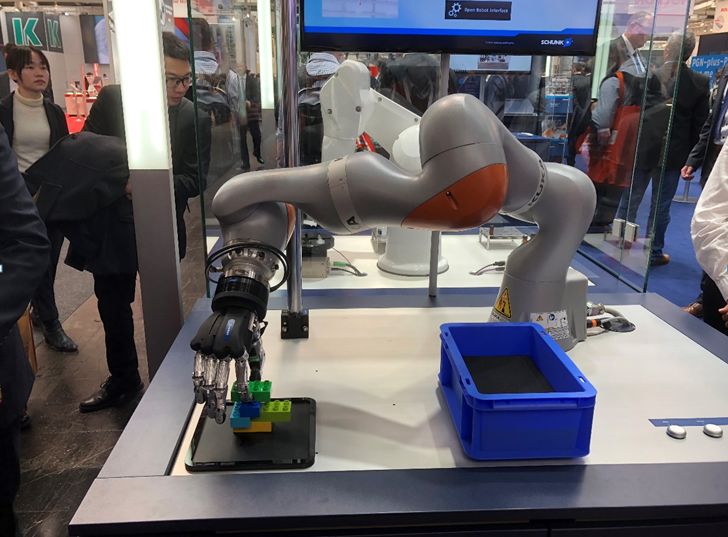 Schunk展示了世界首款通过德国法定事故保险协会(DGUV)的认证可用于人机协作性操作的五指机器人手SCHUNK SVH,再次开创世界抓取系统和夹持技术领域世界之先河。SVH五指机器人配有多个摄像头,通过3D机器视觉多维度获取影像信息,并通过带有自学习功能的AI系统进行信息分析处理,从而处理复杂的分拣与抓取工作任务。在现场,可以将乐高积木可以自由搭配成任何形状,通过机器视觉来判断形状、角度等多维度信息,然后通过AI分析规划最优路径,最后用灵活的手指,对不规则形状物体进行精准抓取。