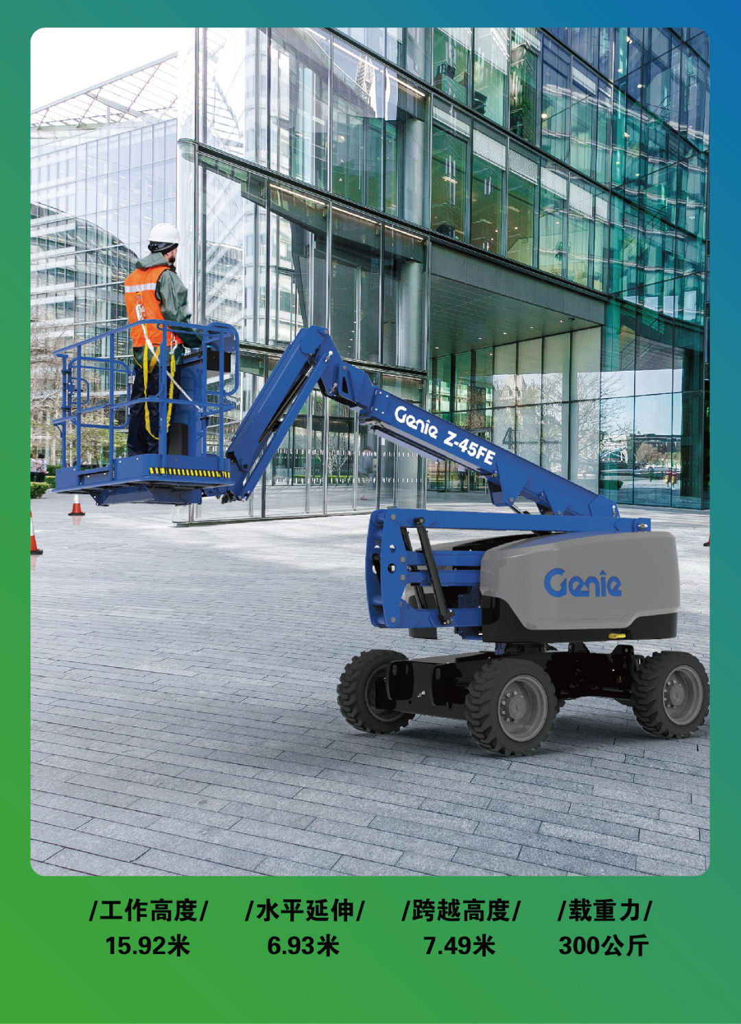 新款的Genie Z-45 FE所采用的混合动力技术与其姊妹款——Genie Z-60/37 FE一样,但该车型的性能更为出众。其工作高度为15.92米,水平延伸为6.93米,跨越高度为7.49米,在15米臂式高空作业市场拥有业内领先的载重力300公斤。集高性能、低排放、节能环保、易维护的四轮交流驱动电机特性于一身,Genie Z-45 FE不仅可以提供环保节能的绿色工地环境,更能提高租赁商的投资回报率。