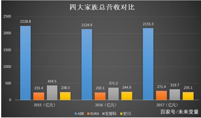 四大机器人家族中,ABB毛利率不是最高,但他拥有最庞大的体量,我们可以从他近三年营收额窥视一二: