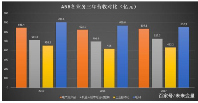 从数据中可以看出来,ABB的营业额远超其他三大公司,当然ABB这么庞大的体量很大一部分来源于它的电力电气业务,电力电气贡献超过50%。