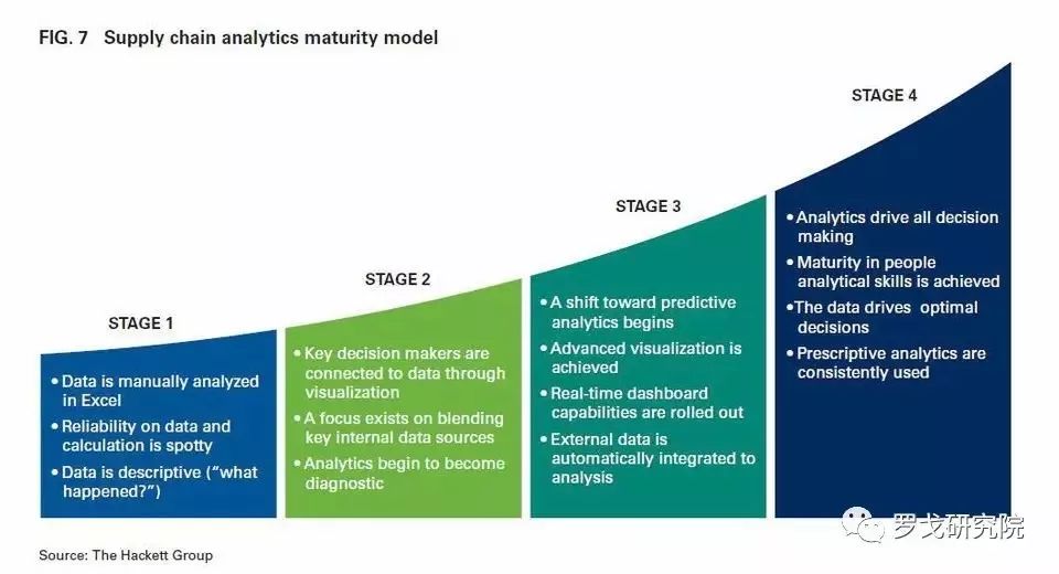 哈克斯的供应链分析成熟度模型按在数据处理及分析的成熟度分为以下四个阶段(见图8)。
