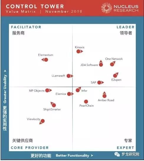 Nucleus Research对供应链控制塔的规范化和价值最大化有多年的研究。它最近发表的研究报告《2018控制塔的价值矩阵》选出了14家优秀的供应链控制塔的供应链商,为企业供应链负责人在选择合适的控制塔产品及供应商方面提供了一个参考指南。