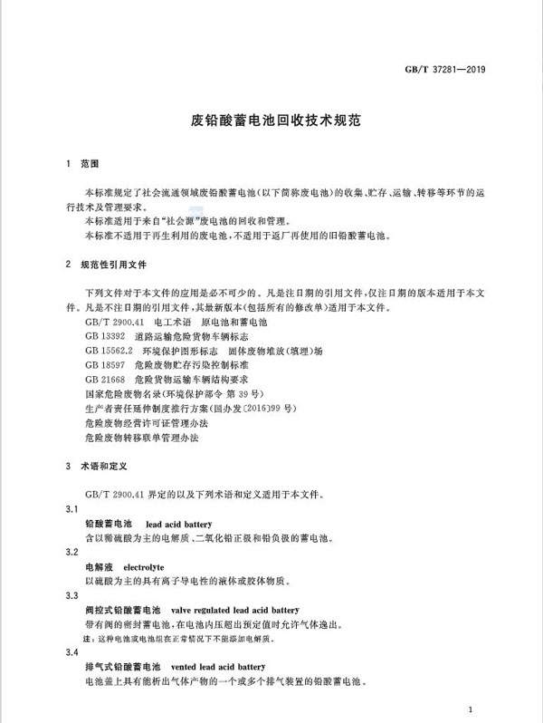 国家标准委正式发布铅酸电池回收标准文件《GB/T 37281-2019废铅酸蓄电池回收技术规范》(文末有完整版),该标准文件由天能电池、理士电源、骆驼股份双登集团、超威电源、华富储能等单位共同起草,归口单位全国铅酸蓄电池标准化技术委员会,主管部门中国电器工业协会,2019年10月1日起实施。