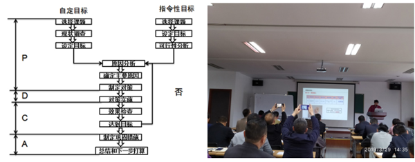 培训已于2019年3月29日进行,由品质部吴一滔讲解,主要围绕如何选择课题、如何展开等基本方法讲解,主要内容包括课题的选择、现状调查、设定目标、(可行性分析)、原因分析、确定主要原因、制定对策、对策实施、效果检查、达到目标、制定巩固措施、总结及下一步打算共十一个步骤,一个完整的PDCA循环。