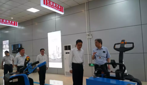 首先,在毕国忠总经理的陪同下,李书记一行参观了韶关展厅和叉车生产车间。毕总向李书记介绍了韶关比亚迪的发展概况,并详细汇报了比亚迪全系列