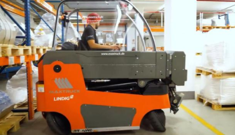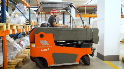 这种叉车名叫Maxtruck 2T,造型非常奇特,它奇怪就奇怪在车轮上,咱们都知道,