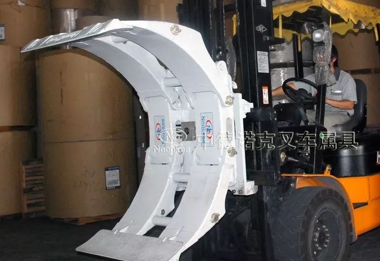 中德诺克叉车纸卷夹有标准型、夹臂分离式、独臂式、手动式四大款式,其中应用最为广泛的是标准型。视频内的纸卷夹即为此款。