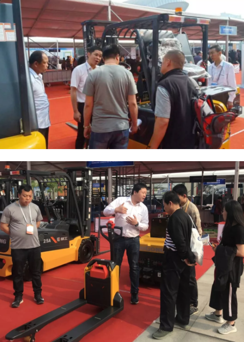 内燃叉车搭配轮胎夹等多款高效低耗、节能环保的产品。现场吸引众多客户及外商驻足观摩,洽谈产品详情并获得多台订单。在