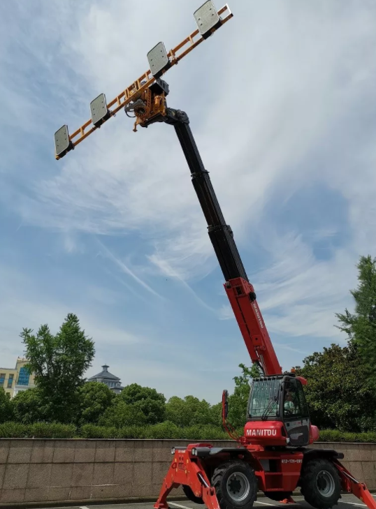 作为国际领先的玻璃幕墙安装工艺,曼尼通旋转型越野伸缩臂叉装车+吸盘