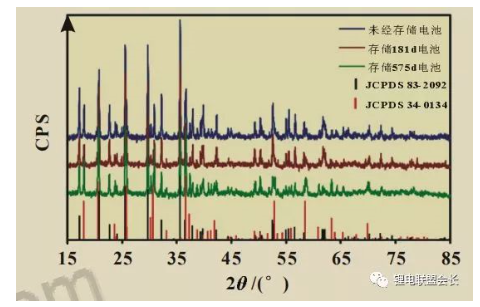 深度脱锂的LiFePO4中会出现与FePO4 XRD图谱非常接近的贫锂相,而深度嵌锂的LiFePO4中会出现与LiFePO4 XRD谱图非常接近的富锂相。在完全放电态的LiFePO4极片中同时存在贫锂相和富锂相,且贫锂相含量随存储时间延长而增加,说明能够嵌入FePO4晶格中的锂离子数量减少。