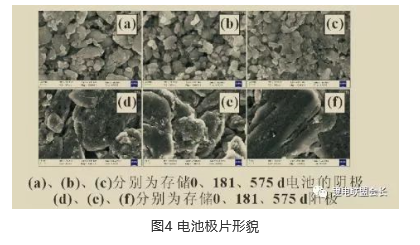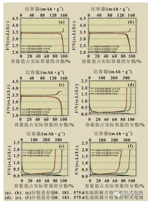 图3(d),(e),(f)中,存储181和575d电池阳极首次充电比容量分别为未经存储电池阳极首次充电比容量(304.5mAh/g)的90.4%和84.5%,与实际电池的容量保持率接近(90.7%和85.8%)。所以,电池容量衰减的主要原因是全电池中活性锂离子的损失。