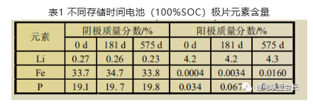 表1为100%SOC电池阴阳极的ICP-OES测试结果。阴极中Li含量变化不明显(~0.25%),阳极的Li含量也维持在同一水平,因此不同存储时间电池中阴阳极极片 Li总量基本保持不变。