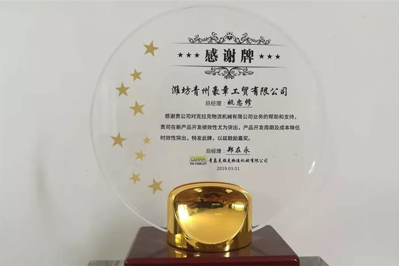 在今年青岛克拉克物流机械有限公司举办的“2018年度供应商年会”上,山东宇信铸业有限公司(原青州豪章工贸有限公司)凭借稳定的产品质量和按期交付,在众多同类供应商中脱颖而出,成为克拉克公司首选供应商,被授予突出贡献奖和感谢牌。