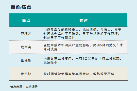 在前期的搬运中,为满足动力和续航的需求,该基地普遍使用燃油叉车。随着时间的推移,该基地使用的燃油叉车频频出现故障,不但维修成本高,且增加了企业成本支出。此外,还面临以下痛点,迫使企业不得不更新搬运设备。