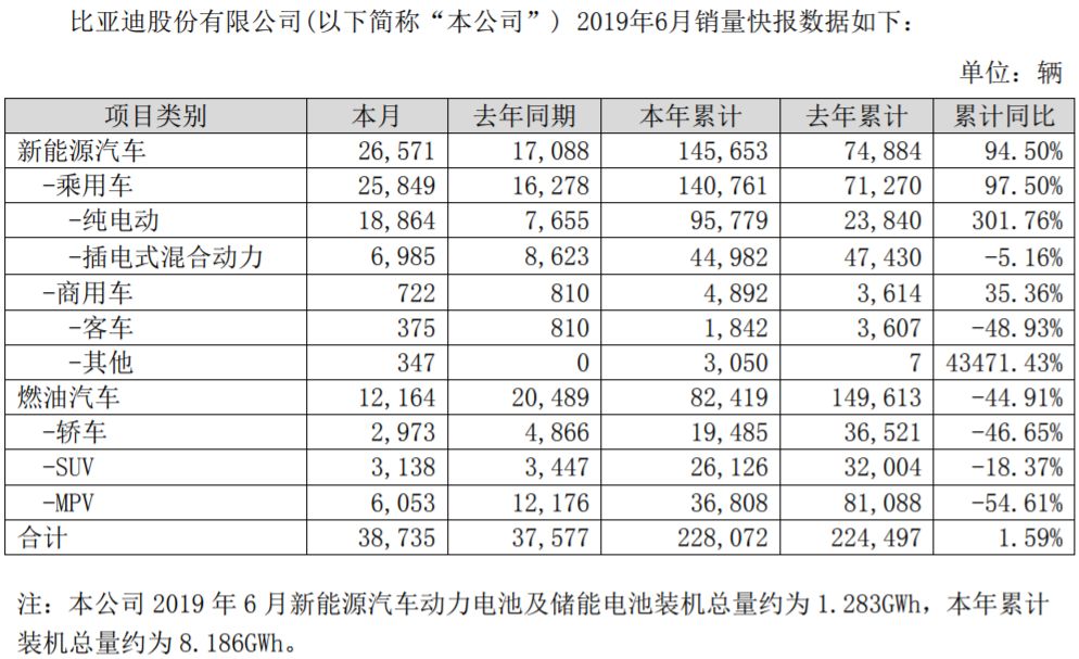 此外,比亚迪还披露,2019年6月新能源汽车动力电池及储能电池装机总量约为1.283GWh,1-6月累计装机总量约为8.186GWh。