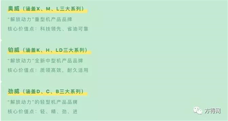 在产品矩阵上,方得网了解到,“解放动力”包含奥威、铂威、劲威三大产品品牌。其中,奥威为“解放动力”重型机产品品牌,涵盖X、M、L三大系列;铂威为“解放动力”全新中型机产品品牌,涵盖K、H、LD三大系列;劲威为“解放动力”轻型机产品品牌,涵养D、C、B三大系列。