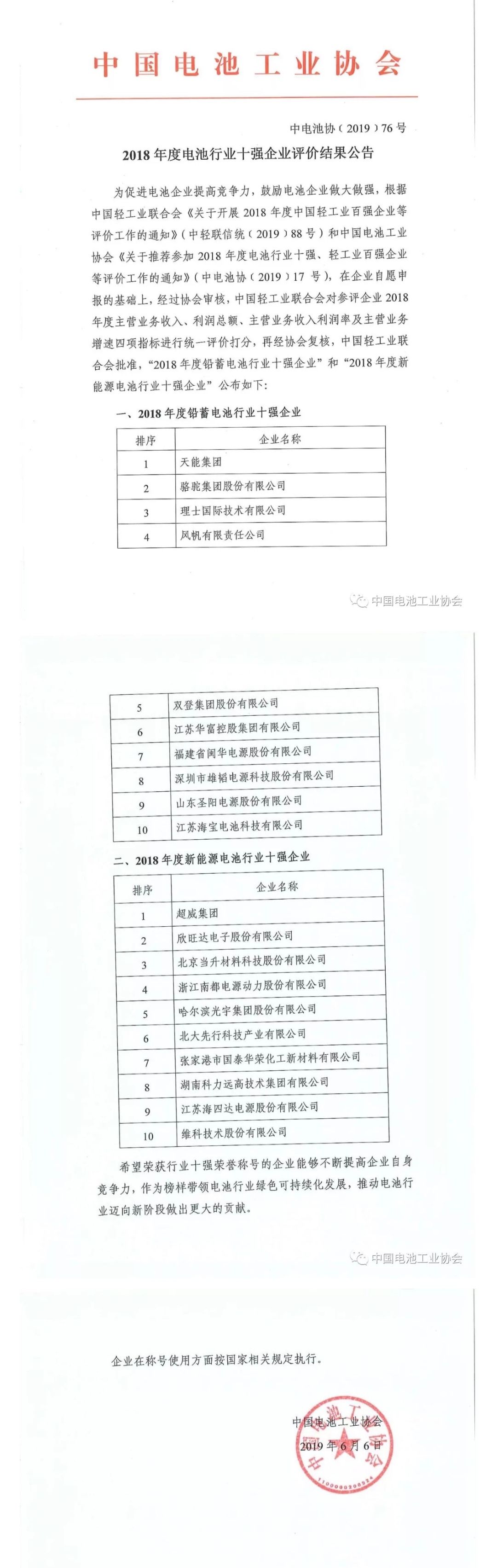 2019年7月9日,中国电池工业协会公布2018年度电池行业十强企业评选结果,理士国际荣登十强企业荣誉榜。