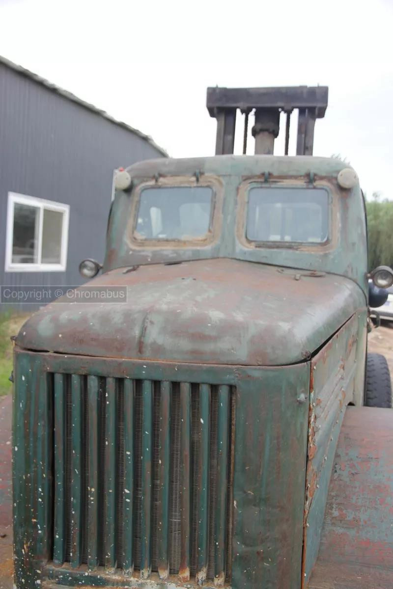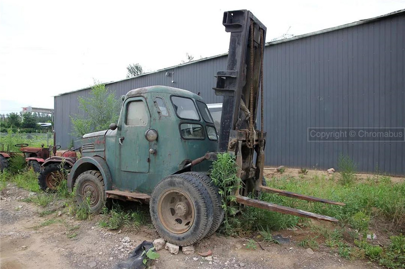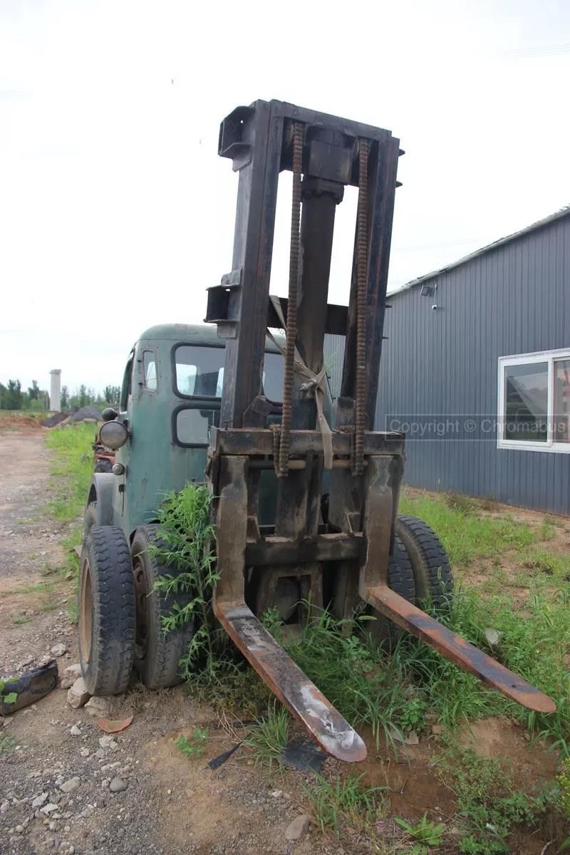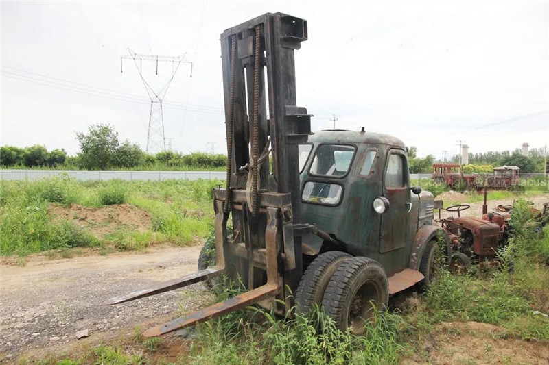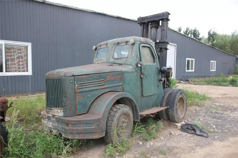 第一眼还以为这是个老解放背着一个叉车架子,仔细一看,当然没有那么简单。这辆叉车与我们今天常见的叉车车身形式基本一致,也是后置发动机前轮驱动,后轮转向。