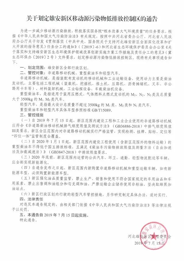 7月15日,雄安新区管委会发布《关于划定雄安新区移动源污染物低排放控制区的通告》,非道路移动机械(包括叉车等)为重点管控对象之一。