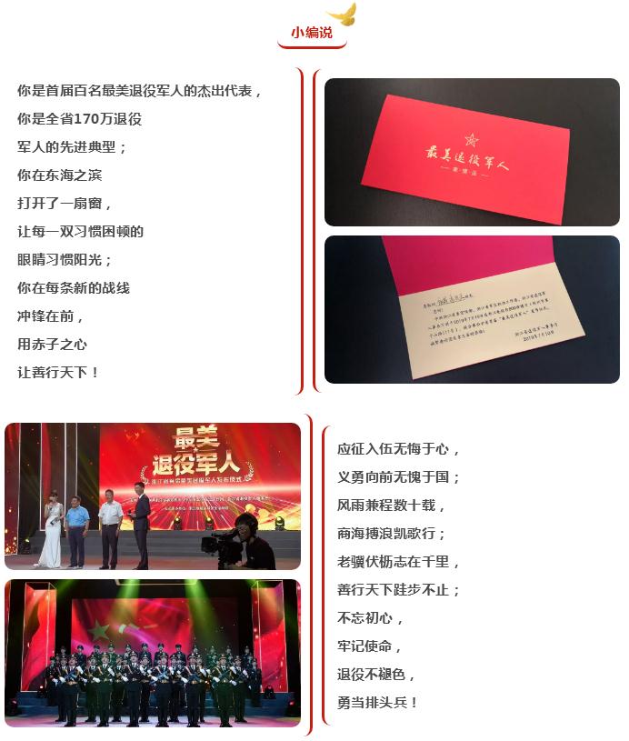 这一次全省最美退役军人评选自从3月份启动以来,在全省各地引起了极大反响,主办方在全省170万退役军人中推荐选举出了100位最美退役军人,其中10位为被评为“十大优秀退役军人”。宁波如意名誉董事长储吉旺光荣入选。