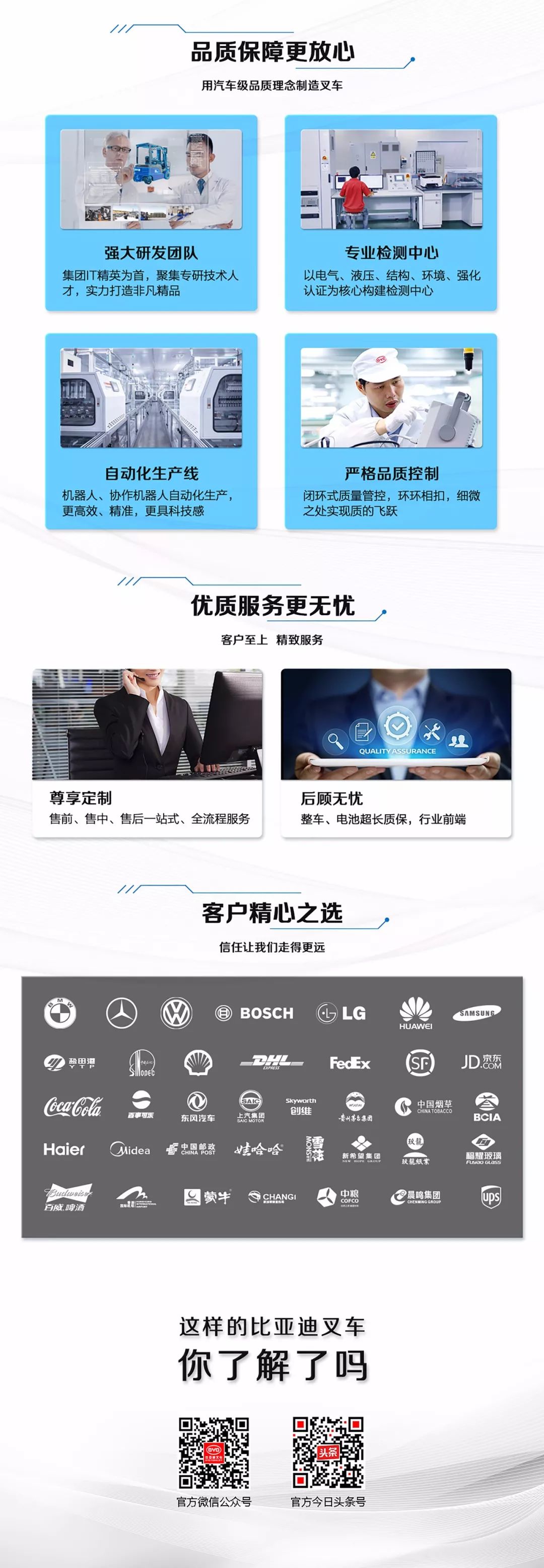 【研发实力】 比亚迪始终坚持“技术为王,创新为本”的理念,在电动叉车研发上投入技术研发人员150人,其中专项研究电器和液压的博士2名,硕士32名,国家211重点本科院校毕业生97名。具备同时研发平衡重式、托盘式、前移式、堆垛式四大系列纯电动叉车的能力。
