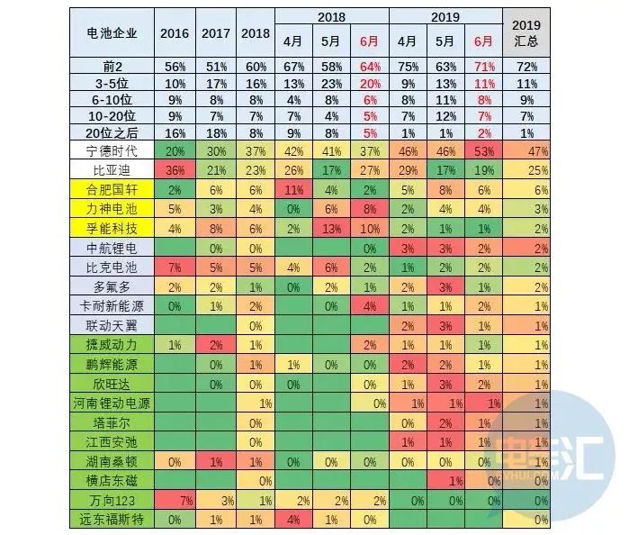 宁德时代1-6月市场份额达到47%,相较于2018年大幅增长,比亚迪的电池市场份额为25%,也比2018年有所增长。由于前两位电池企业的装机量增长,3~5位的电池企业份额相对下降,从2018年1-6月的16%下降到2019年的11%,其他的中间企业变化幅度不大。