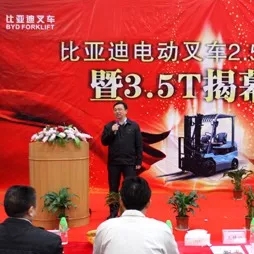 比亚迪电动叉车在广州发布暨全国营销启动,比亚迪叉车在广州物流展成功发布新品并开始启动全国营销模式,正式开始市场开发和销售。