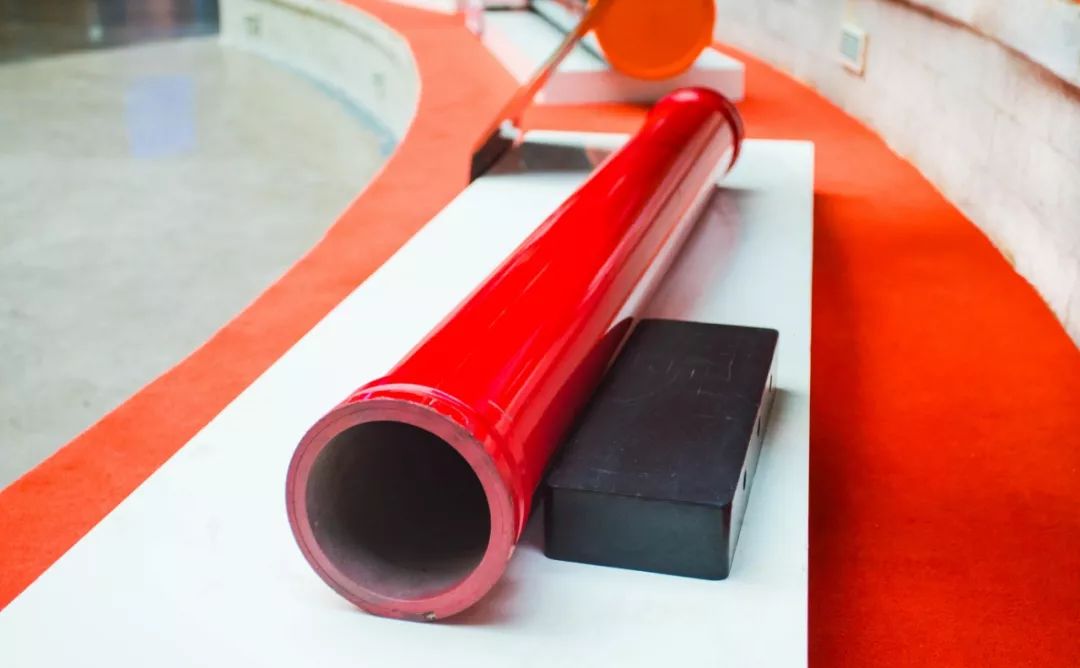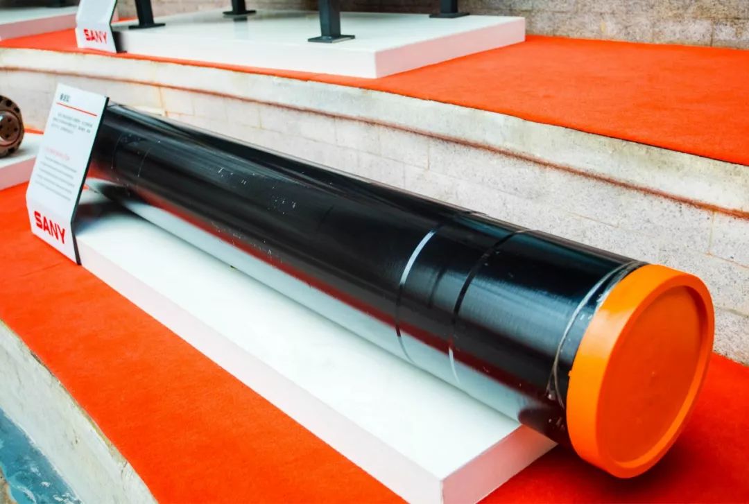 展示区展示的是一根五代直管。它采用了具有自主知识产权的内控淬火工艺和双层复合结构,硬度达到60HRC,耐压15MPa,平均寿命5万方以上,高于同行30%,达到国际领先水平。