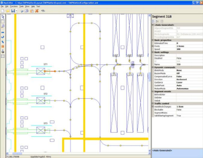 在MAX编辑器上用户可以看到系统的布局和系统里的所有组成部分。可以使用滚动、扩大等功能看到系统里最小的细节。系统里的所有物体,比如导航路径、充电站或者AGV都可以编辑。当点击一个物体时,这个物体就显示在MAX编辑器方格里,这样用户就可以对系统里的任何物体根据需要进行编辑了。MAX编辑器是一个功能强大但易于使用的配置工具。
