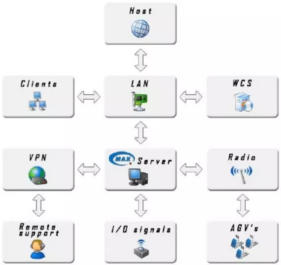 在任何AGV系统里,MAX需要通过不同的通信媒介控制并与很多硬件技术通信。MAX支持使用广播和无线网络通信与AGV进行通信。另外一个特点是硬件设备之间的输入/输出信号交换提供给MAX当前光电池、防火门以及紧急停止按钮的状况。
