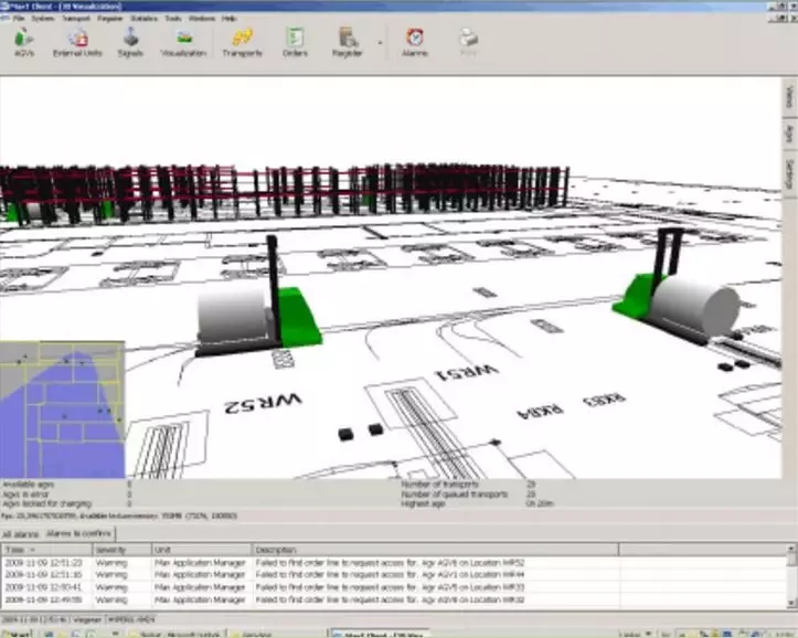 在MAX里,所有的系统配置都是通过MAX编辑器在3D可视的情况下完成的。运输、仓储、追踪、缓冲、任务交换、动态路径选择、站点选择、充电控制、任务的优先安排、避免死锁的发生,所有这一切功能都显示在实时的3D可视图里。这就使得用户可以配置系统的所有部分,从取货点、存储点的位置及运作情况到单台AGV的名字等。