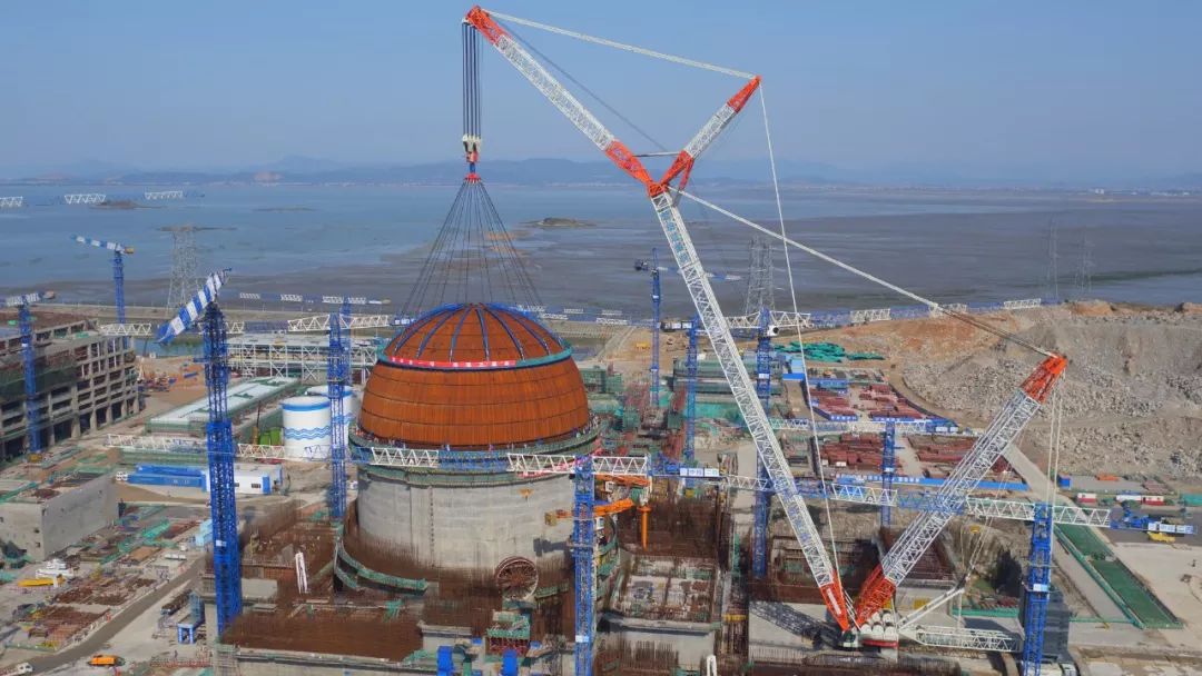 ▲应用中国专利金奖获奖专利的中联重科3200吨履带式起重机参与“华龙一号”穹顶吊装