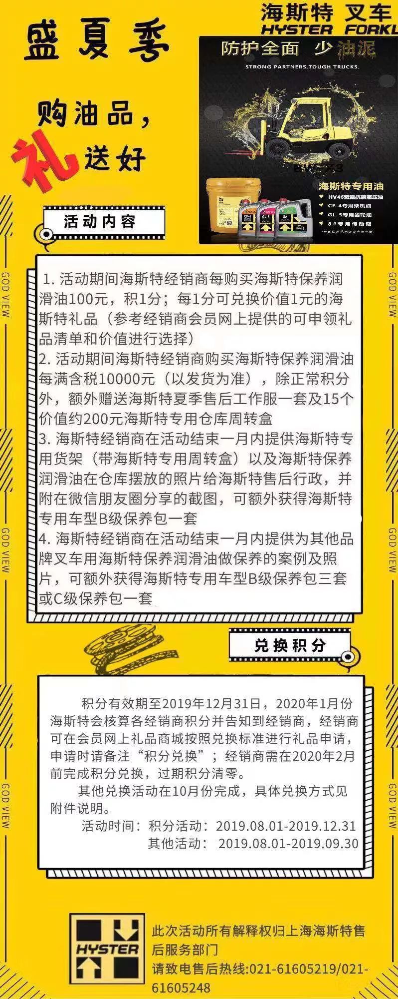 八月,为了回馈大家的对我们的大力支持,海斯特售后市场部现推出海斯特油品促销活动,快来抢购吧!