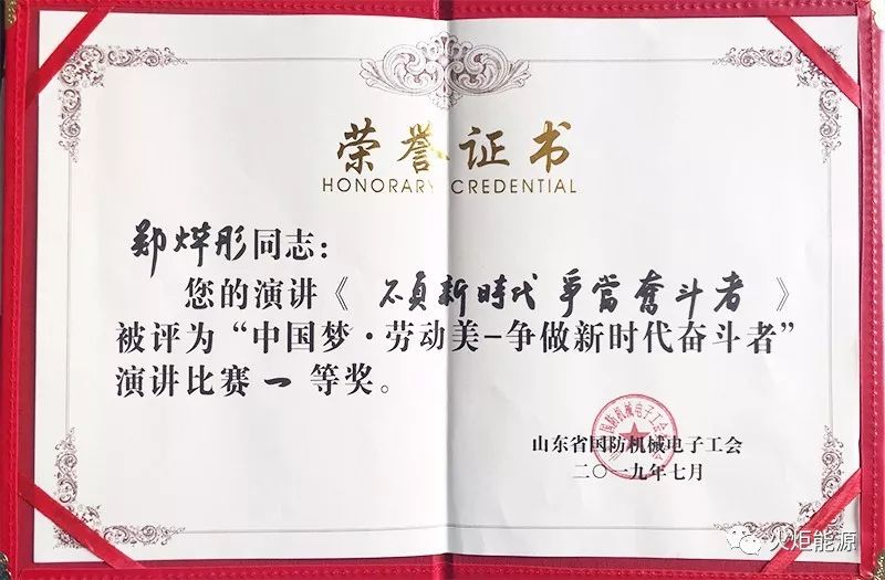 7月30日,在山东省国防机械电子工会、淄博市总工会联合举办的“中国梦.劳动美——争做新时代奋斗者”职工演讲比赛中,我公司员工郑烨彤荣获一等奖(上图左四)。