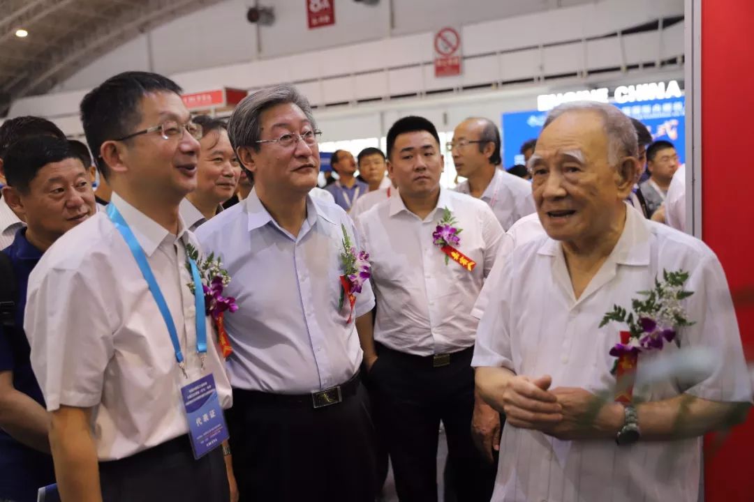 ▲▲原机械工业部部长何光远(右一)等领导莅临解放动力展台,勉励解放动力坚持自主创新,始终成为中国汽车工业的骄傲。解放发动机事业部副总经理黄成海(左一)陪同参观