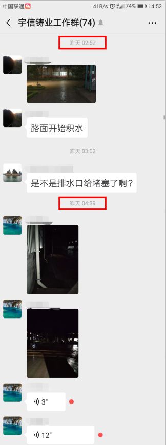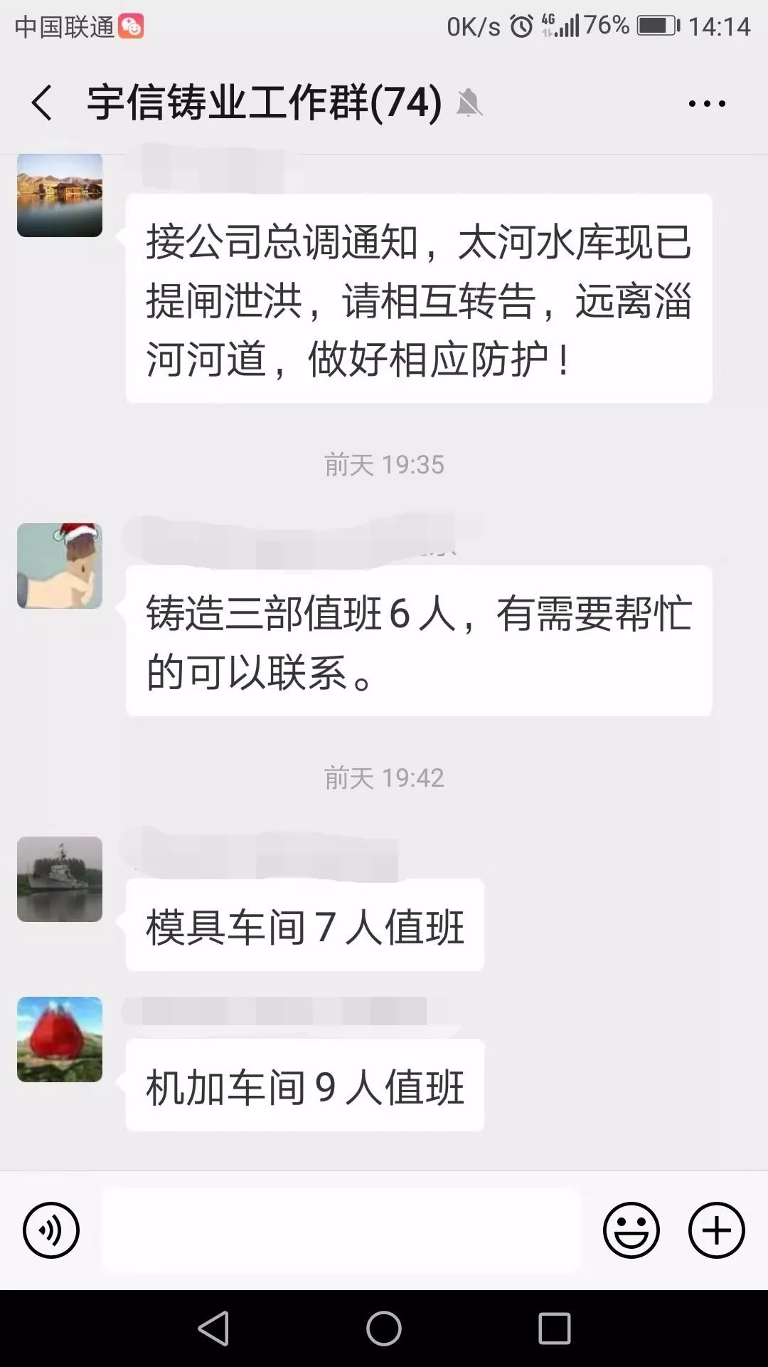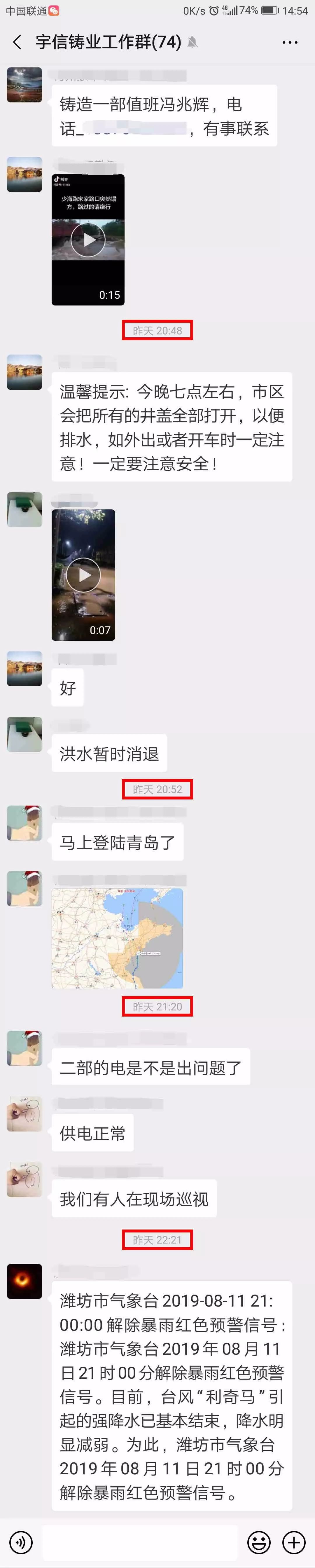 8月10日-11日,随着超强台风“利奇马”的临近,宇信铸业立即成立了多支防汛小组,并在微信工作群里接连发出预警消息,及时通报台风影响、厂区积水地段情况、防汛工作进展和人员配备值班情况。