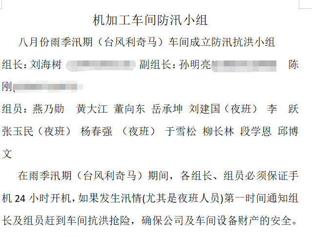 在台风“利奇马”来临之前,公司的各部门负责人已经准备好充足的抢险物资,抢险人员全部到岗位值班,对各车间的门口以及道路进行防水的加固。