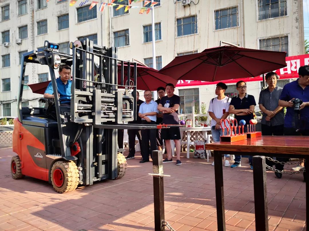 在产品推介会的同时,我们特邀请了曾获得“林德杯”国际叉车大赛总冠军的朱久安老师(现任职长春汽车工业高等专科学校),为大家带来了精彩的叉车表演:钢丝挂啤酒瓶, 搬运台球项目。烈日当头,现场观众们的热情却丝毫不减。只见叉车缓缓开动,货叉向前伸出触碰到满装的啤酒瓶,轻轻抬起,再挂到更细的钢丝绳上,让人看得惊心动魄。本次表演项目使用的叉车为林德电动平衡重叉车E20P,不仅考验司机的操作能力,同时也在考验叉车的作业性能。林德叉车拥有良好的微动性能,传承了德国的优秀技术及高效的作业能力,可以充分体现人车合一,从而能够在极短的时间内实现操作的精准性。